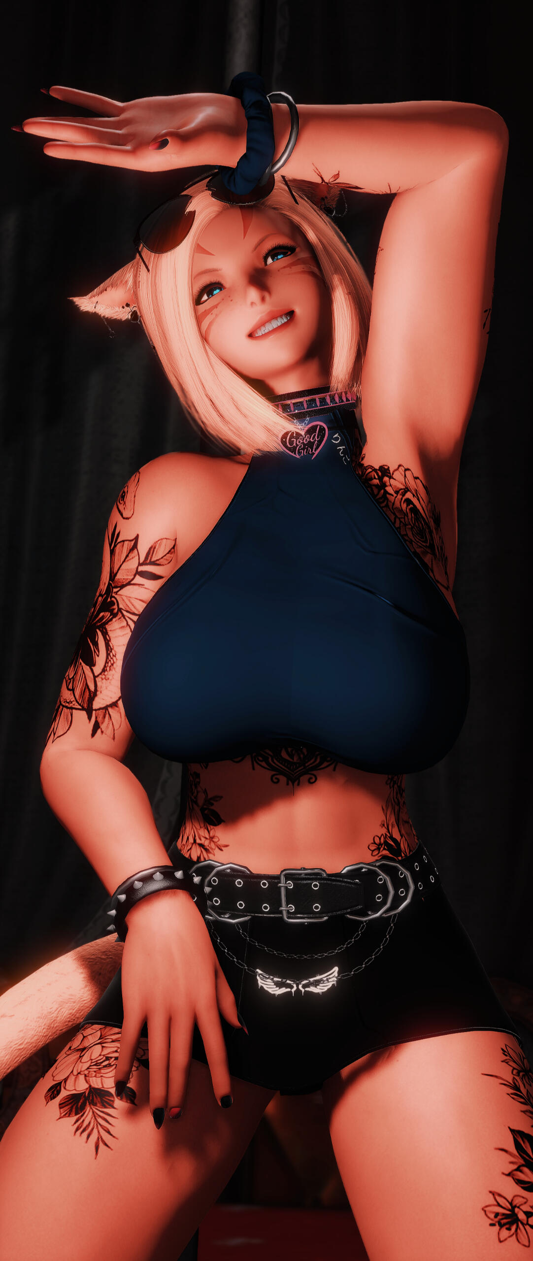Background: Abandoned as a kitten on the outskirts of the prosperous city-state of Ul'dah. Raised by the fiercely independent Seekers of the Sun, she learned the art of erotic dance as an offering to Azeyma, Goddess of the Sun and Inquiry. Her days were spent honing her combat skills and her nights in the vibrant halls of the desert city, where she captivated audiences with her mesmerizing performances.